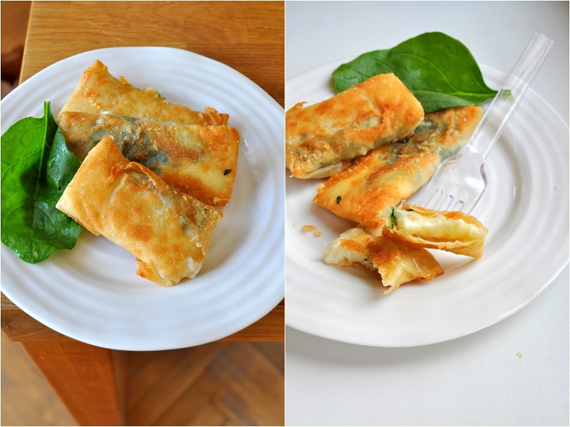- Na okraj těsta jsem rozdrobila sýr a přidala jsem takové množství čerstvého špenátu, aby závitek šel zabalit. Směs jsem opatrně zabalila a všechny okraje jsem potřela vodou a slepila. Vznikl z toho úhledný balíček. Těsto se nesmí nikde protrhnout, jinak sýr vyteče do pánve.