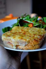 Tímto toustem jsem se inspirovala na jiném blogu http://www.closetcooking.com/2007/04/croque-monsieur.html. Je to hodně hutná ale dobrá záležitost. Bešamelová omáčka vás doufám moc neodradí, je to celkem jednoduchý proces. )))Jinak doporučuju podávat se zeleninovým salátem.