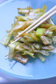 Nakrájela jsem si pórek asi na 5 cm kousky, ty jsem rozkrájela podélně asi na 5 částí. Použila jsem bílou i zelenou část pórku. Pak jsem do rozpáleného oleje dala česnek a pórek. Obojí jsem restovala do měkka. Na závěr jsem nudličky pokapala sojovou omáčkou a asi minutu restovala.
